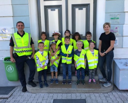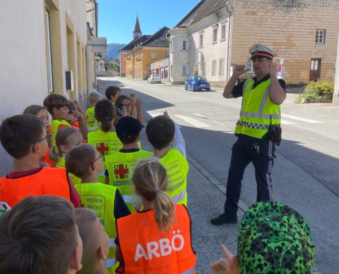 Am Mittwoch, 20. September 2023, nahm sich der Herr Bürgermeister und Polizist Ferdinand Lerchbaumer Zeit, um mit den Kindern der 2. Klasse die wichtigsten Gefahrenstellen am Schulweg zu besprechen.